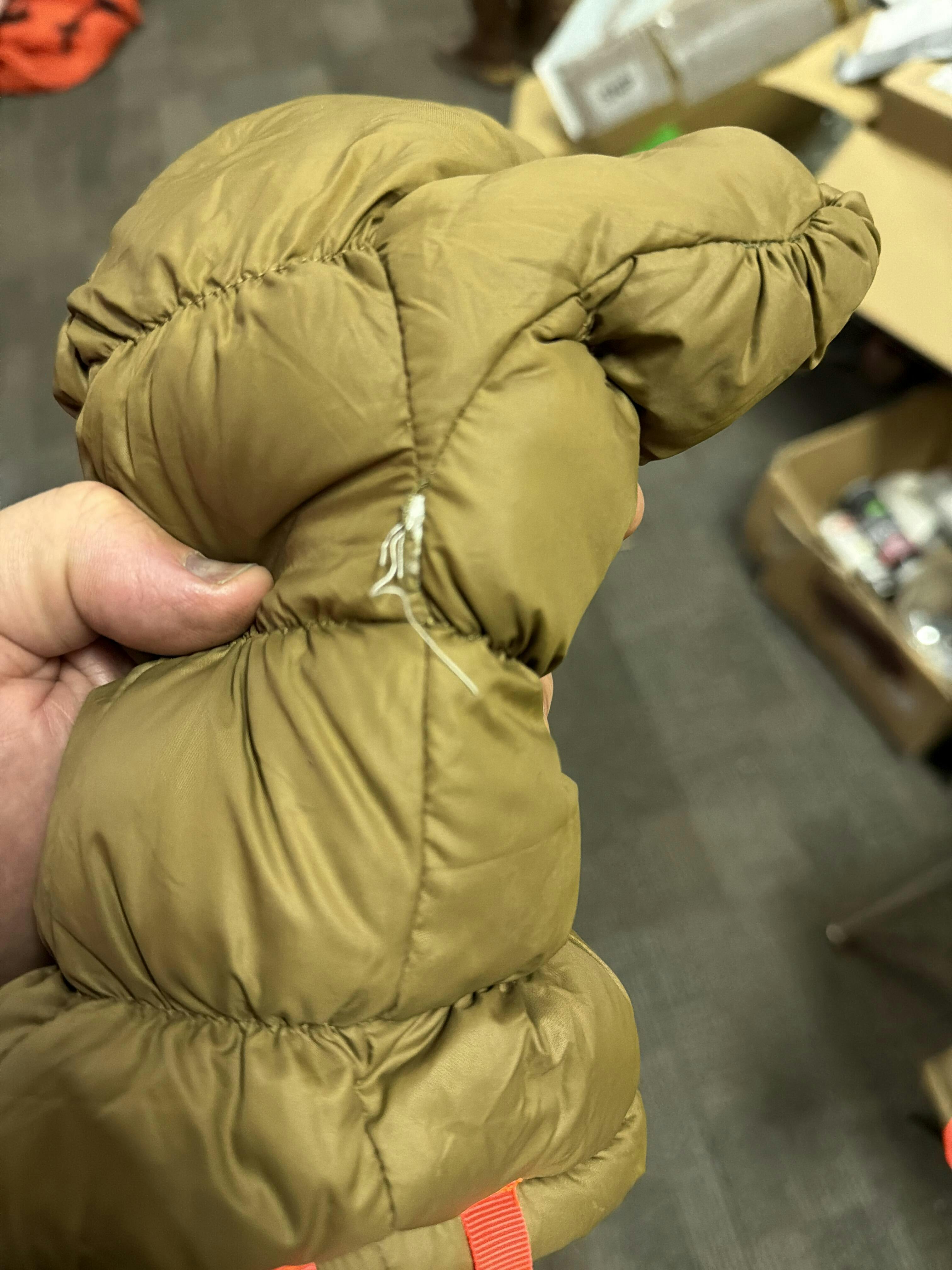 The way in because thestitching cuts it in half.Tons of threads are loose and the baffles are merging. It looks like the panels on the left mitt was sewn inside out, the nonslip dots are on the inside. Just ridiculously bad.